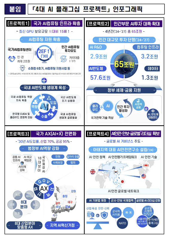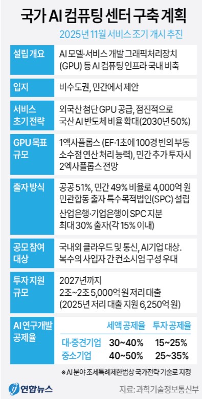 [1] 대한민국 정책브리핑 - 국가 AI컴퓨팅 센터 구축(SPC 설립) 실행계획(안) (https://www.korea.kr/common/download.do?fileId=198029149&tblKey=GMN)