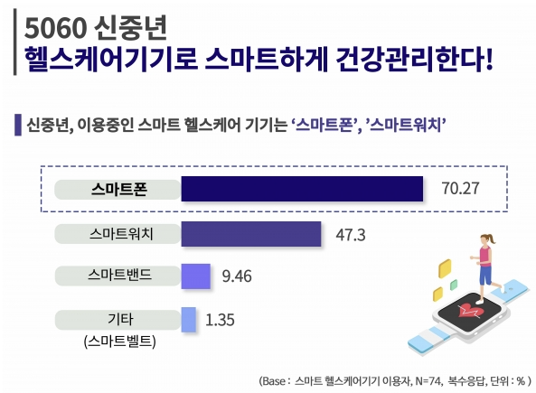 또한, 스마트폰을 활용한 건강 관리가 증가하고 있습니다. 한 조사에 따르면, 50대와 60대의 70% 이상이 스마트폰을 사용하여 건강 정보를 관리하고 있다고 합니다.