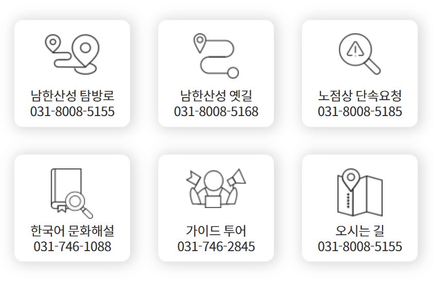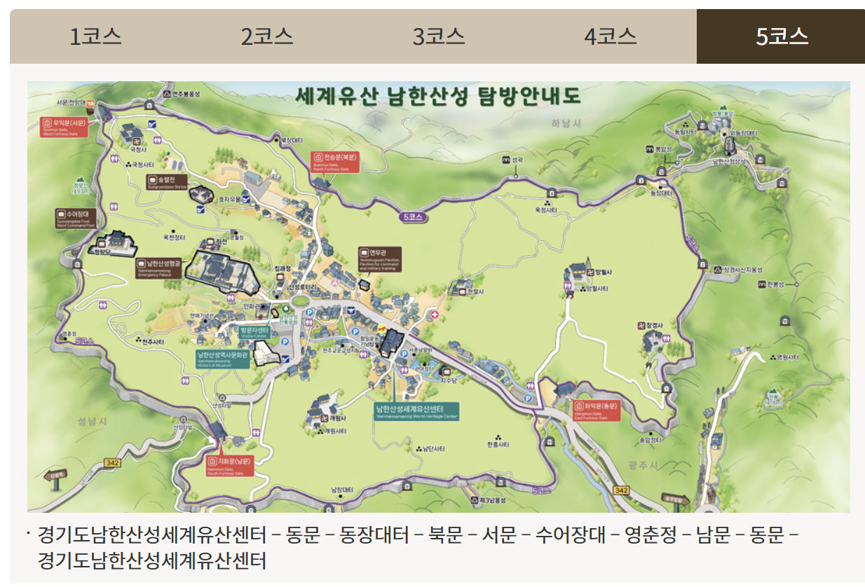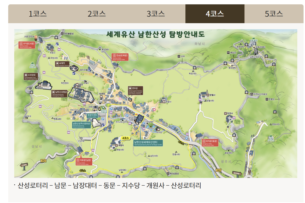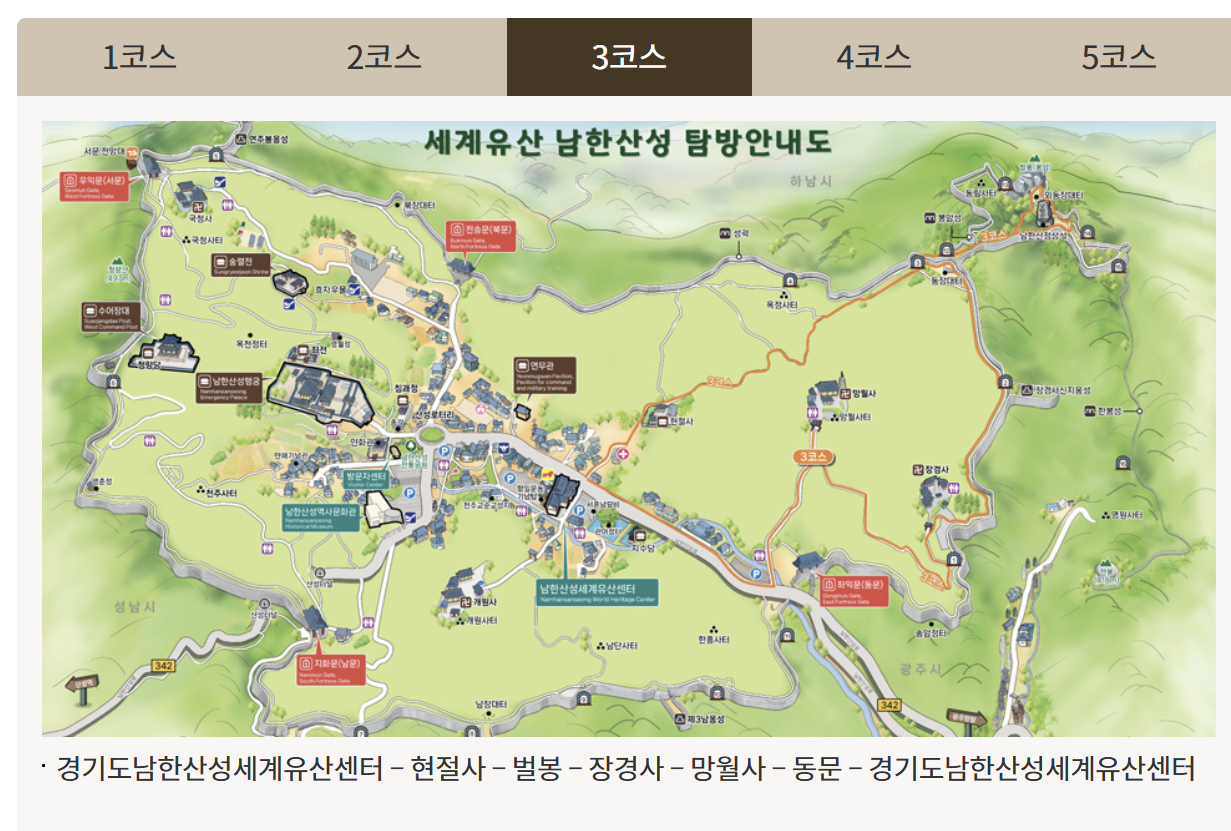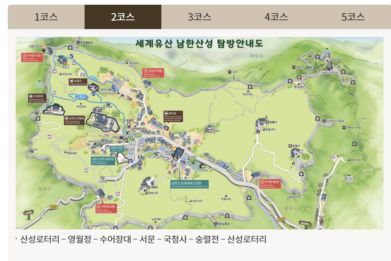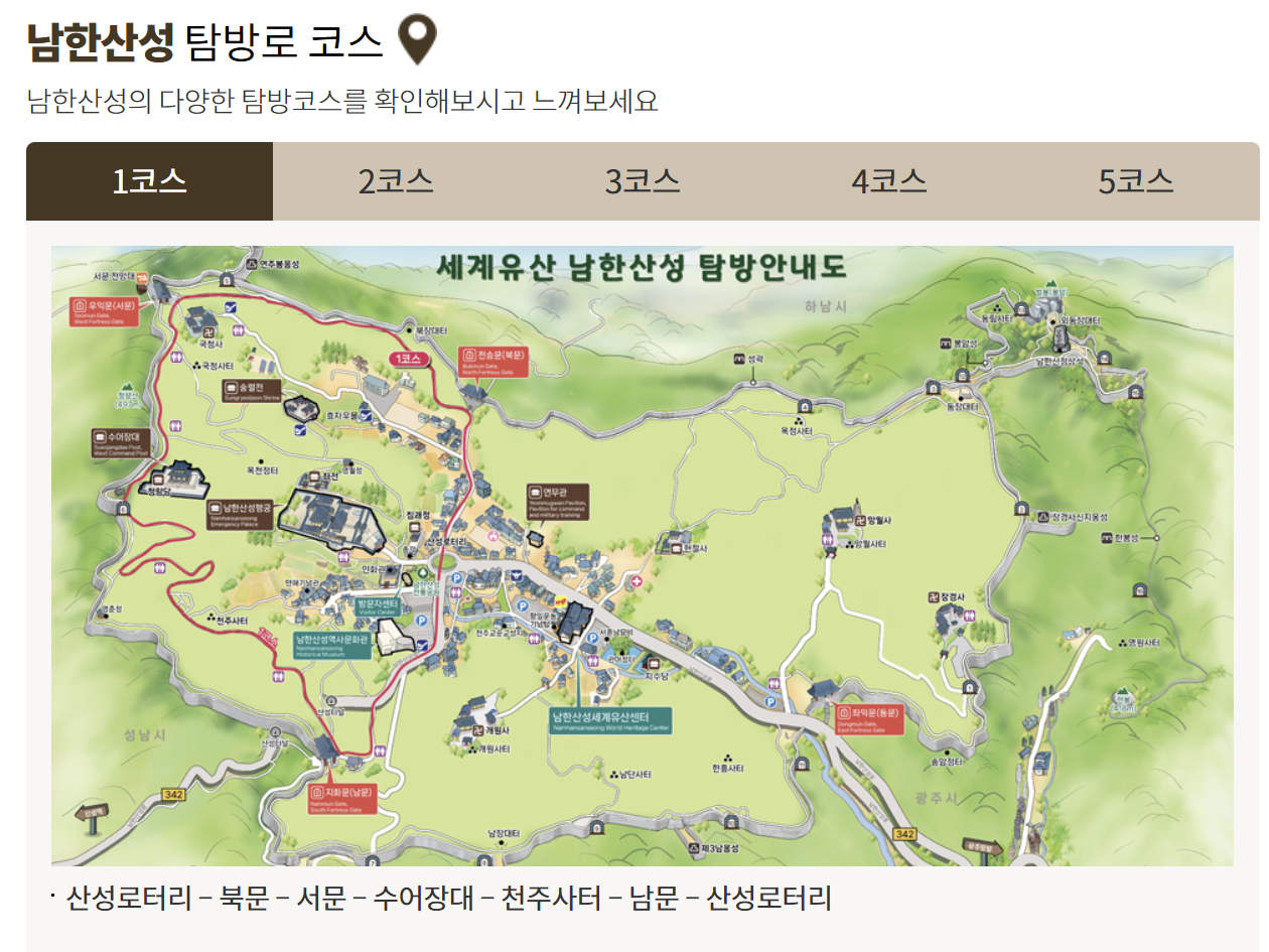| 남한산성 순환코스 | 광주시 | 약 6km | 2시간 | 역사적인 성곽길과 숲길 조화 |