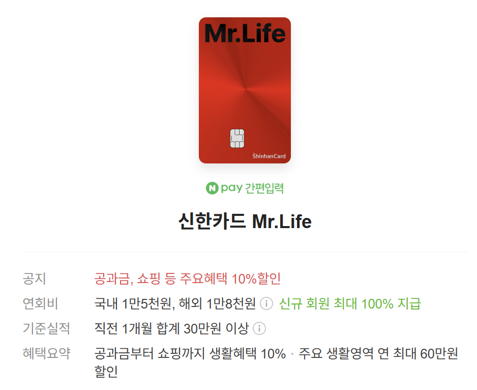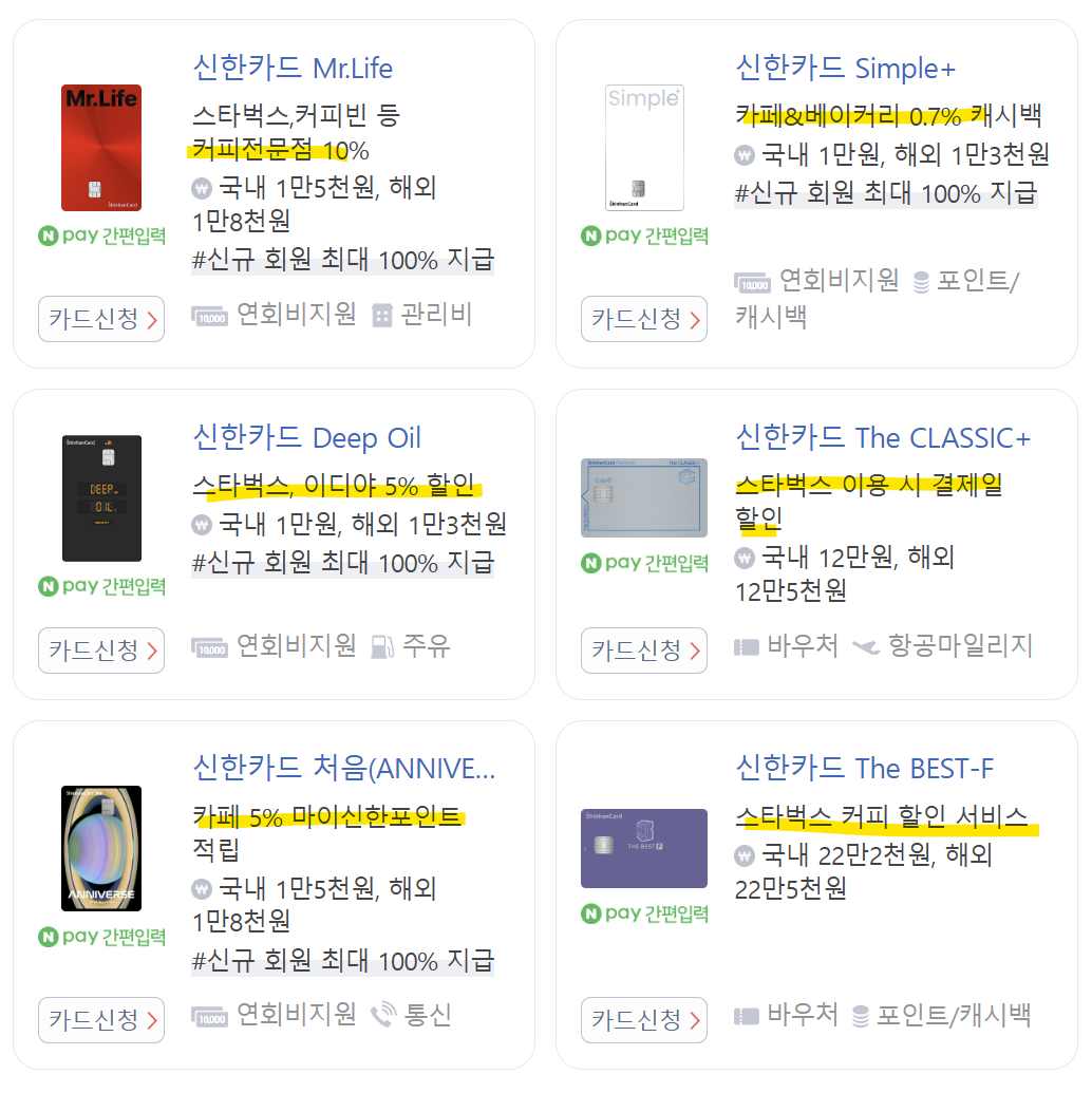 | 신한Mr. Life 카드 | 스타벅스 10% 마이신한포인트 적립 | 1.5만 원 | |