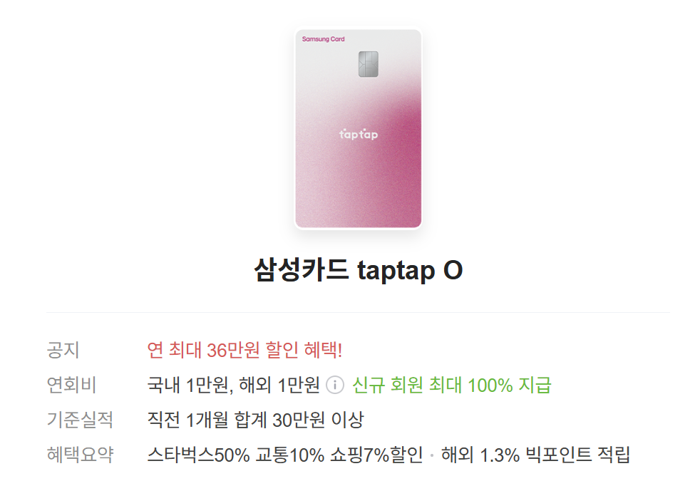 - 삼성 taptap O: 스타벅스+배달앱+넷플릭스 할인