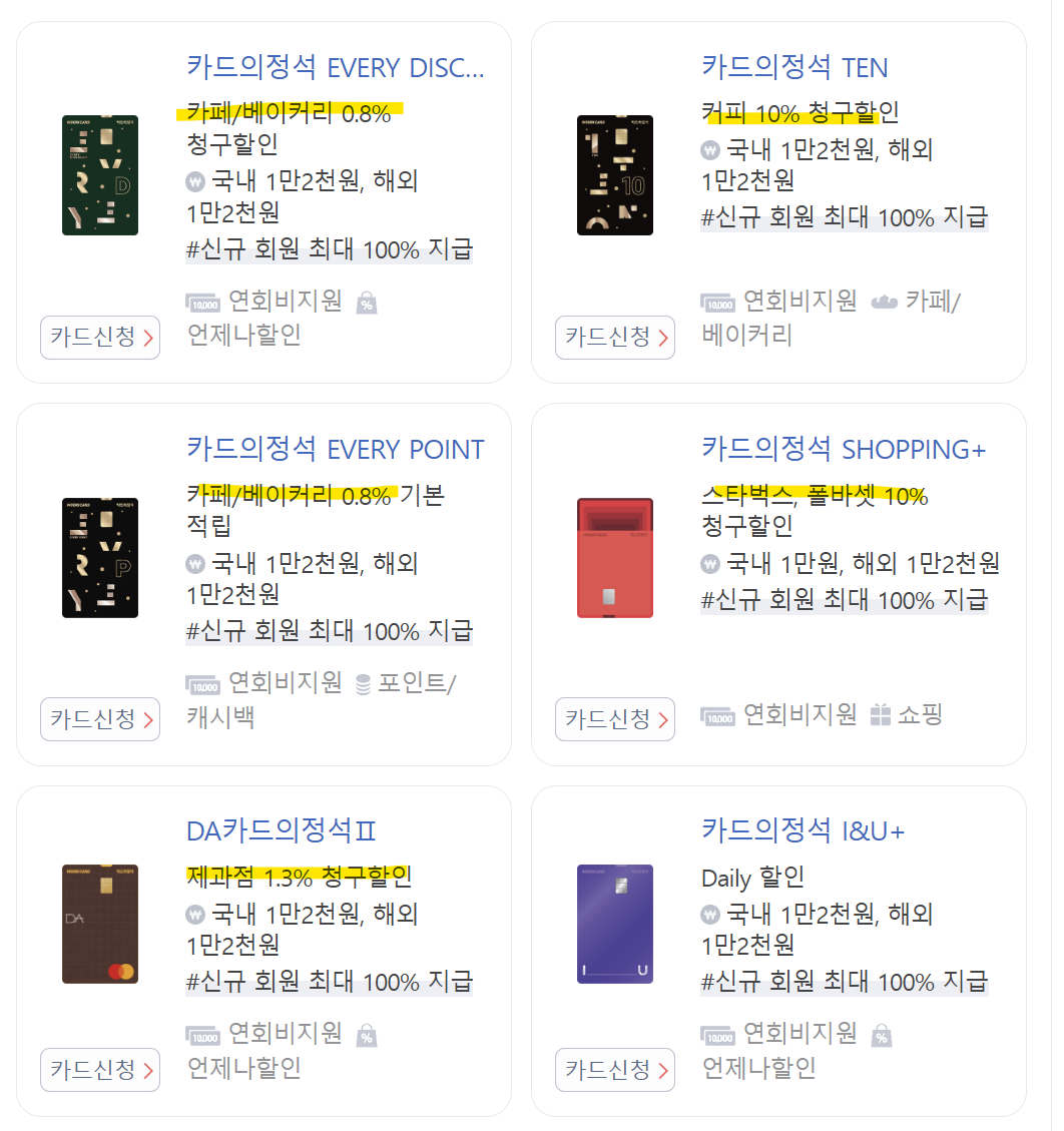 - 커피 브랜드가 너무 한정된 카드 (한 군데만 할인)