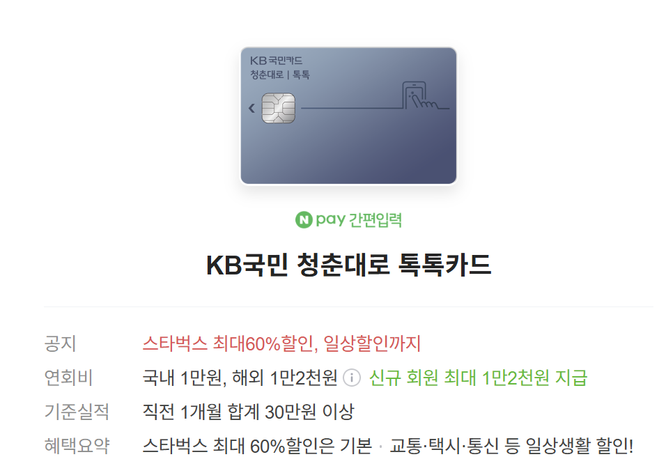 | 국민 청춘대로 카드 | 스타벅스 최대 60% , 커피·편의점 10% 할인 | 1만 원 | |