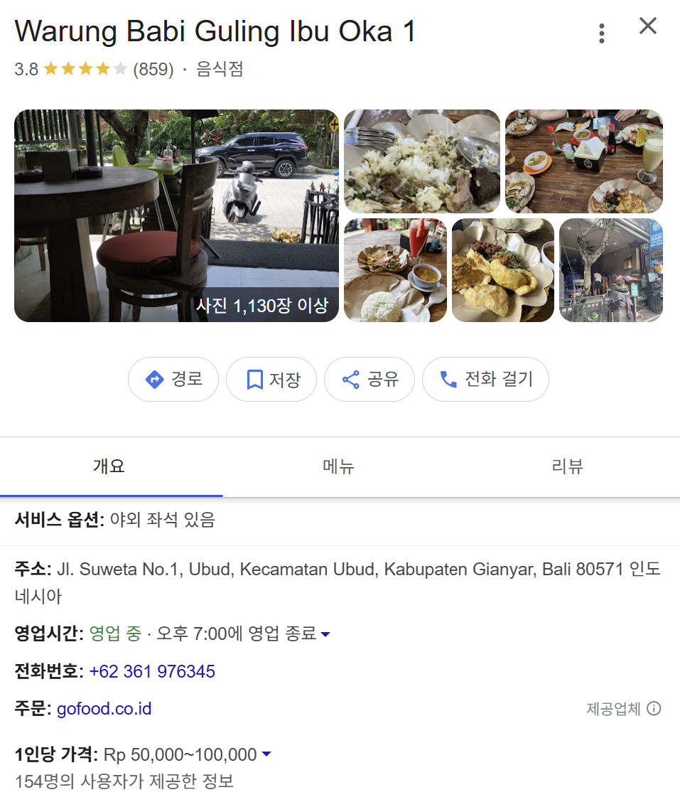 | 발리 | Warung Babi Guling Ibu Oka | 바비굴링 (돼지구이) | 우붓 |